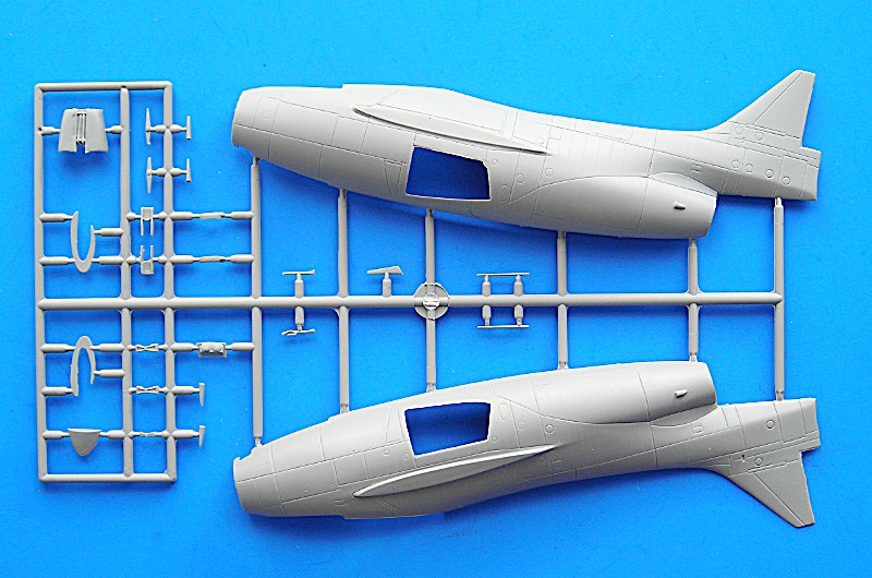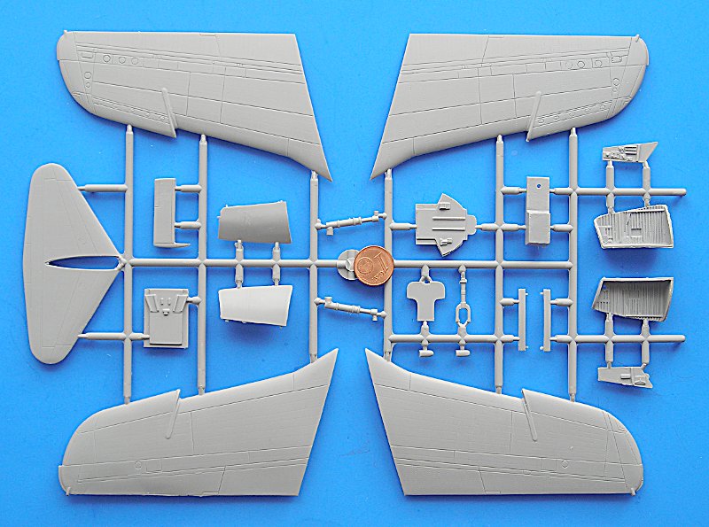 Mit Öffnen der Box fällt sofort auf, das wir einen klassischen short run Bausatz vor uns liegen haben. Die zwei grauen Spritzgussrahmen enthalten die großen Teile zum Bau des Modells. Die Gravur ist versenkt ausgeführt, aber recht tief und breit bzw. unscharf – d.h. Die Gravuren besitzen keine scharfen Kanten, sondern verlaufen sich etwas in die Oberfläche. Darüber hinaus ist der Verlauf der Gravur zum Teil etwas wackelig. Die wenigen angedeuteten Nietenreihen wirken dagegen sehr fein. Die Kanzel ist ebenfalls ein Spritzgussteil und leidlich durchsichtig. Ein Bad in Future/Klear sollte dies optimieren... nachdem der Anguss und der Grat entfernt sind.