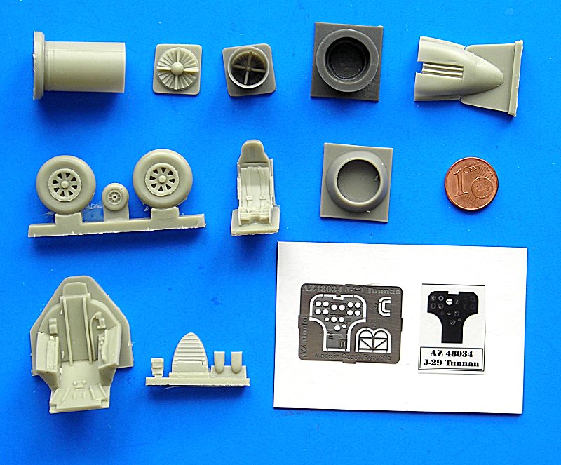 Für das Cockpit, die Räder und die Schubdüse liegen 14 Resinteile bei. Diese sind gut, erreichen aber nicht die Qualität von z.B. Aires. Außerdem haben sie ungünstig liegende und großflächige Angüsse. Der „Nasenring“ ist noch einmal in verbesserter Form als dunkelgraues Teil beigefügt. Die Gurte sind am Schleudersitz mit angegossen. Das Instrumentenbrett mittels eines Fotoätzteils und eines Fotonegativs für die Skalen dargestellt. Wer nicht so gerne selber malt, kann aber auch auf den als Zubehör herausgebrachten, farbig bedruckten Fotoätzteilsatz zurückgreifen.