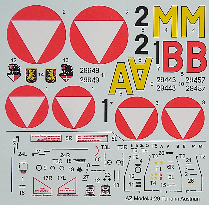 Der kleine Decalbogen erlaubt die Darstellung dreier Flugzeuge der Luftstreitkräfte des Österreichischen Bundesheers. Der Bogen ist sauber gedruckt und enthält auch Wartungshinweise. Die Bemalungsanleitung findet sich auf dem Farbig bedruckten unteren Karton. Die Position der Wartungshinweise wird in der kleinen (A5) Bauanleitung gezeigt.