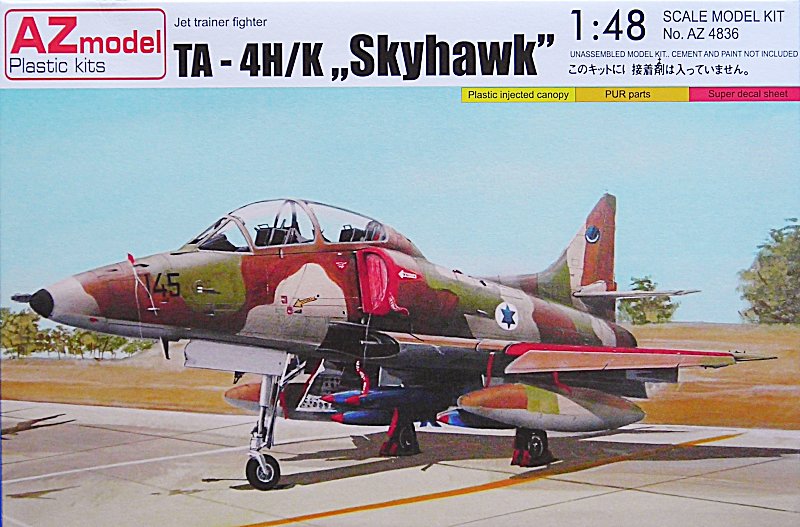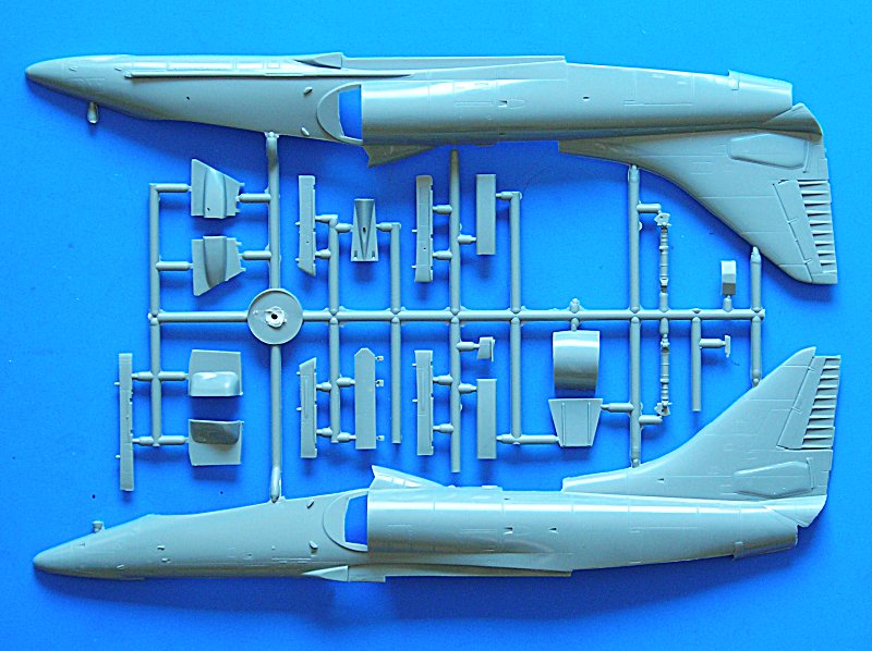Bausatz: AZ ist ja dafür bekannt, auch mal Bausätze anderer Hersteller wieder aufzulegen. Hier ist es der Skyhawk-Doppelsitzer von Classic Airframes. Die Plastikteile entsprechen den von Sword bekannten und sind relativ hart und hochglänzend. Die Gravuren sind auf hohem Niveau. Allerdings war die Passgenauigkeit bei den Sword kits oft nicht so besonders. Dies wird erst der Bau zeigen können. AZmodel hebt auf der Packung besonders hervor, dass die Kanzel ein Spritzgussteil ist. Warum ist mir unklar. Der Spritzling ist in Ordnung, aber nicht in irgendeiner Weise herausragend.