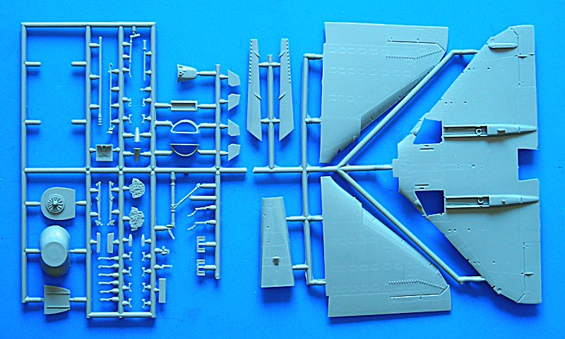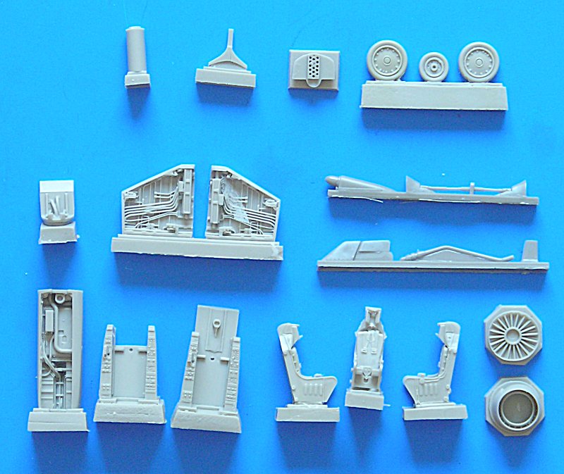 Außerdem liegt dem Bausatz eine größere Anzahl von Resinteilen bei. Diese detaillieren insbesondere die Fahrwerksschächte und das Cockpit. Bei mir liegen 3 Schleudersitze bei ... ich konnte aber bisher keine Beschädigung eines Teils Feststellen, daher handelt es sich wohl um einen Packfehler. Soweit ich feststellen konnte fehlt aber kein anderes Teil .. hoffentlich habe ich mich nicht verguckt. Leider liegen keine Photoätzteile bei, so dass man im an sich ansprechenden Cockpit mit den Plastik-Instrumentenbrettern vorlieb nehmen muss.