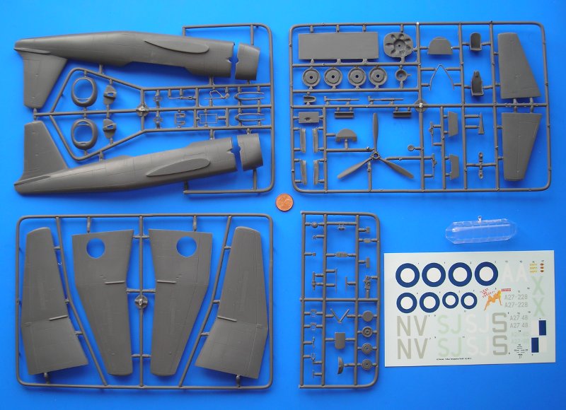 Dieser Bausatz ist schon seit langer Zeit angekündigt und wurde von vielen an den Luftstreitkräften des Commonwealth interessierten Modellbauern sehnsüchtig erwartet. Nun, nach mehrjähriger Wartezeit, ist er endlich erschienen. Im Karton befinden sich 4 graue Spritzlinge und ein Klarteil für die Kabinenverglasung, welches lose im Beutel herumschwappt. Der erste Eindruck ist ganz gut, denn die Gravur ist scharf und ebenmäßig ausgeführt.