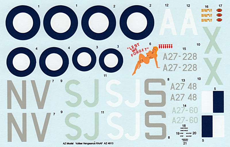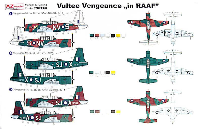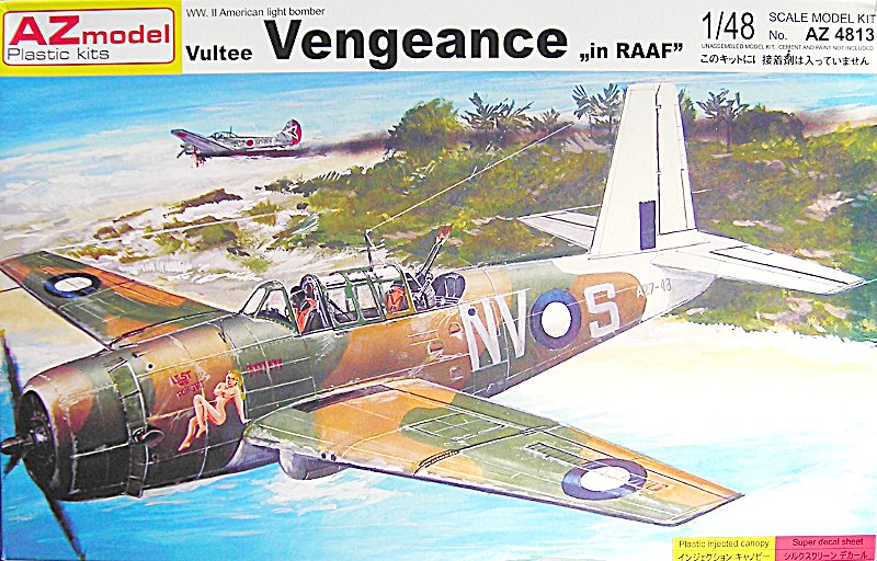 Vorbild: Die Geschichte des Sturzkampfbombers Vultee Vengeance begann 1939 mit der Vultee Model 72 (V-72). Das Flugzeug war als einmotoriger Tiefdecker mit geschlossenem Cockpit für zwei Besatzungsmitglieder ausgelegt und wurde von einem luftgekühlten Wright Cyclone R-2600 Doppelsternmotor mit 1622 PS angetrieben. Die Vengeance Mk. I bis III war mit vier vorwärtsfeuernde 7,62-mm-MGs in den Tragflächen und zwei bewegliche 7,62-mm-MGs im hinteren Cockpit bewaffnet, bei der Mk.IV (A-35B) waren dies 12,7-mm-MG, ebenfalls vier in den Flügeln und ein bewegliches im Abwehrstand. Im internen Bombenschacht konnten zwei Bomben von 227 kg mitgeführt werden und zusätzlich zwei Bomben von 113 kg an Flügelstationen. Die Mk.IV (A-35B) konnten durch den stärkeren Motor eine größere Bombenlast an den Flügelstationen mitführen, dort waren nun zwei Bomben von 227 kg möglich.