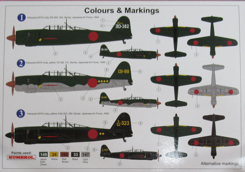 Vorbild: Die Kugisho D4Y Suisei mit dem alliierten Codenamen "Judy" entstand als trägergestützter Sturzkampfbomber für die kaiserlich japanische Marine. Sie löste die erfolgreiche Aichi D3A ab. Schon 1938 begann die Entwicklung als Ganzmetallkonstruktion mit einem sehr breitspurigen Fahrwerk. Im Gegensatz zum Vorgängermuster konnte es eingezogen werden. Als Triebwerk diente ein Lizenzbau des deutschen DB 601 welcher unter der Bezeichnung Aichi Atsuta in Lizenz gebaut wurde. Er leistete immerhin 1200 PS. Der Kühler wurde unterm Triebwerk eingebaut und sorgte für das charakteristische Aussehen. Im Dezember 1940 flog der erste Prototyp.