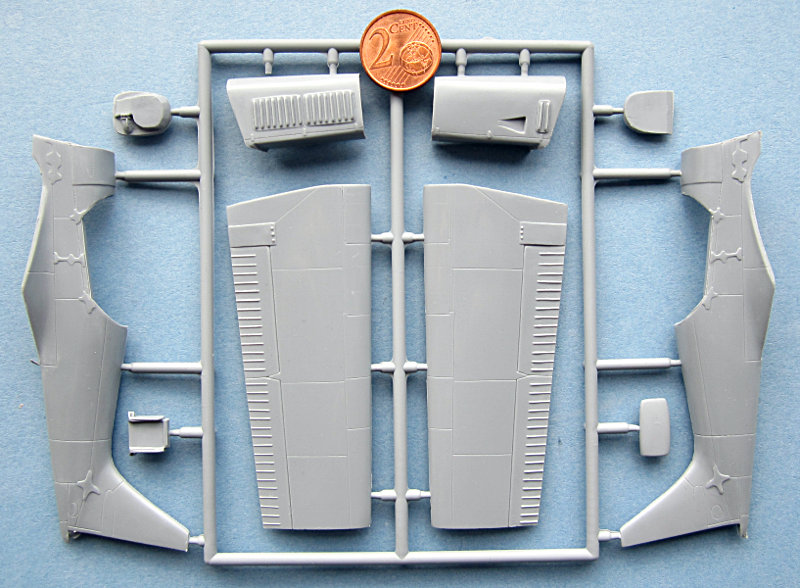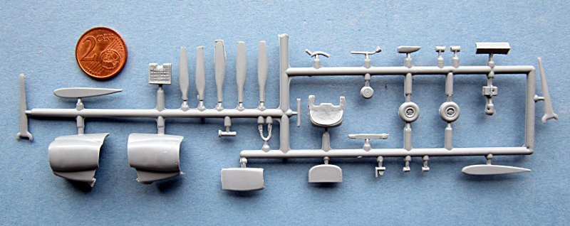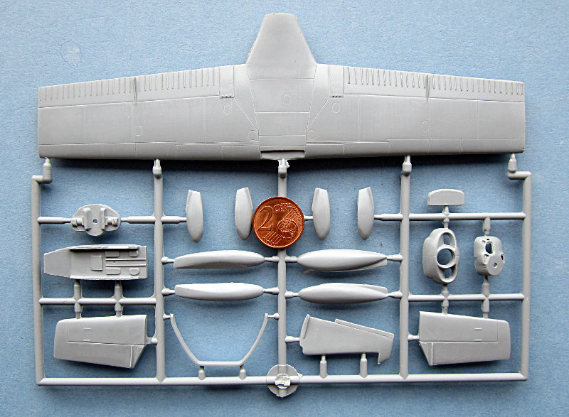 Der Bausatz wurde in bekannter "short run"-Manier ausgeführt. Der Inhalt der Kiste sieht wie ein zerteilter Spritzrahmen aus, daher ist es recht schwierig zu definieren wie viele davon nun wirklich beiliegen. Die Teile sind sind nachwievor gut abegspritzt mit feinen Oberflächengravuren, allerdings gibt es hier und da kleinere Gusslunker. Das Material ist eben und glänzend (=gut polierte Form), was die Farbgebung der Kunstflugzeuge erleichtern sollte ... wenn denn nicht allzu viel Spachtel- und Schleifarbeit anfällt. Die Kabinenhaube habe ich inzwischen wegen der Gefahr des versehentlichen Abbrechens vom Gussast befreit (HyperCut-Säge). Sie ist an den Kontaktstellen zum ziplock-Beutel leicht mattiert und sollte poliert und mit passenden Mitteln(Klear/Future usw.) auf Hochglanz gebracht werden.