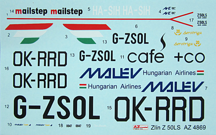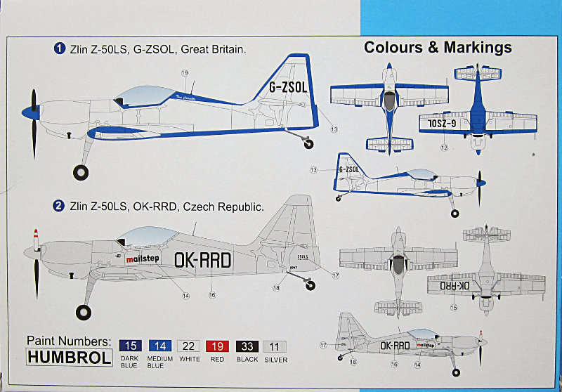 Eine kleine Platine mit Ätzteilen dient vorwiegend der Cockpitdetaillierung. Der Spinner ist in Resin gegossen und die Blätter des Propellers sind am Spritzling. Die Markierungen befinden sich auf einem kleinen Decalbögen mit den spezifischen Markierungen der 3 Flugzeuge. Das heißt, dass man die beiden mehrfarbigen Maschinen passend abkleben und lackieren muss, was insbesondere bei der MALEV-Maschine nicht ganz trivial ist. Die Farben sind entsprechend des Humbrol-Systems bezeichnet und sollten sich somit leicht durch Produkte des favorisierten Farbherstellers ersetzen lassen. In solchen Fällen bieten sich die sich die Color-Reference-Charts von Urban Fredriksson auf der Seite der IPMS Stockholm an...