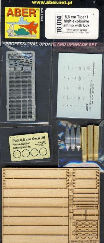Im großem Maßstab 1/16 gibt es ein weiteres gelungenes Zubehörset für die Aufbewahrung der Munition vom deutschen Tiger I Panzer. Es beinhaltet: Holzteile für die Box, drei in Messing gedrehte Hülsen, drei in Aluminium gedrehte Geschosse, zwei kleine Ätzteilplatinen, einen kleinen Decalbogen und die ausführliche Bauanleitung.