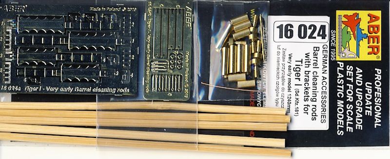 Klasse gemachter kleiner Zubehörsatz für die Aufbewahrung der Geschützrohr Reinigungsstangen an sehr frühen Tiger I Panzern. Auch bei diesem neuen Set hat der polnische Hersteller wieder sein Möglichstes versucht um den anspruchvollen Militärmodellbauer zufrieden zu stellen. So wurde nicht nur Holzrundmaterial für die Stangen beigelegt, nein auch an die Metallanfang- und Endstücke, mit neuen einsetzbaren separaten Gewindestück, wurde gedacht. Wie sollte es anders sein bei Aber, die Reinigungsstangen können so nach Bedarf zusammengeschraubt werden, halt wie beim Original. Auch wurden bei der Halterung der Stangen die Abstandshalter zur Verschlussschiene durch ein perfekt gedrehtes Messingteil ergänzt.