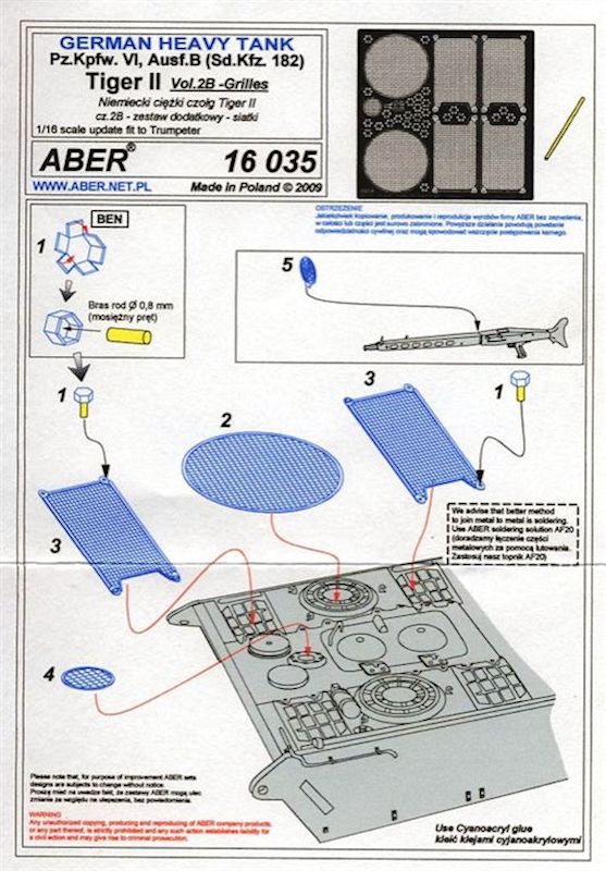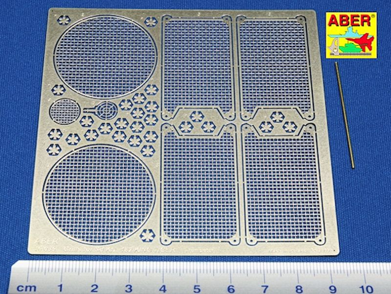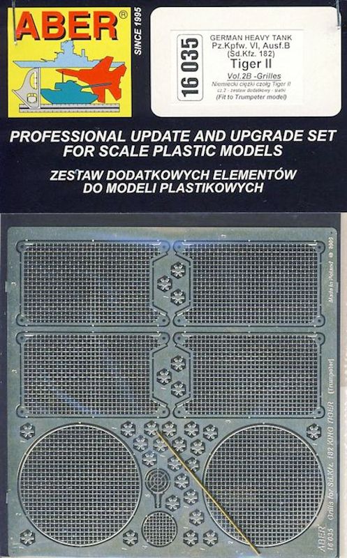 Dieser Ergänzungssatz ist für das Tiger II Modell von Trumpeter gemacht, kann aber auch für den Tamiya Tiger verwendet werden. Im Lieferumfang befinden sich eine große Ätzteilplatine, Messingdraht Ø 0,8mm und die Einbauanleitung. Anhand dieser können nun die neuen Gitter für Kühler -und Lüfterabdeckungen ergänzt werden, als Zusatzteile liegen noch die "Sechskantschrauben" zum Befestigen der Gitter und ein Visier für das MG bei.