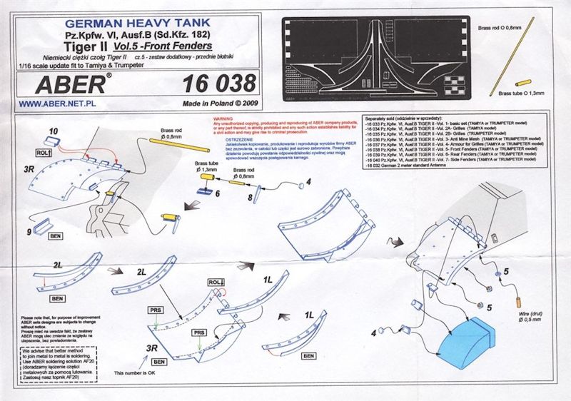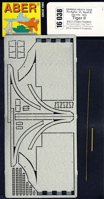 Dieser Ergänzungssatz ist sowohl für die frühen- als auch für die späteren Tiger II Modelle geeignet. Damit kann das Tiger II Modell von Trumpeter und Tamiya ergänzt bzw. überarbeitet werden. Im Lieferumfang befinden sich eine große Ätzteilplatine, Messingdraht Ø 0,8mm, 1,3mm Messingrohr und die Einbauanleitung. Anhanddieser können die neuen vorderen Kettenabdeckungen mühelos zusammengebaut werden und so die vorhandenen Plastikteile ersetzen.