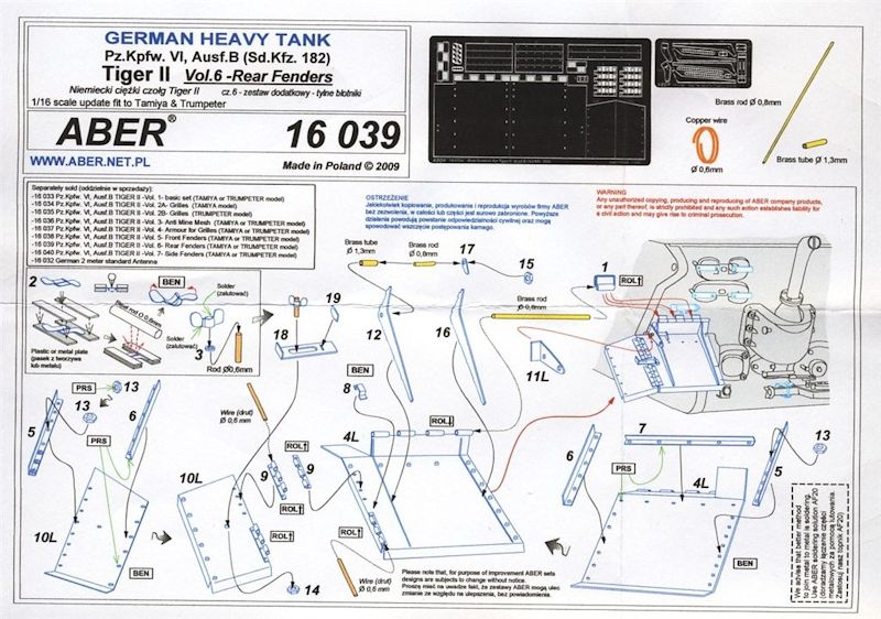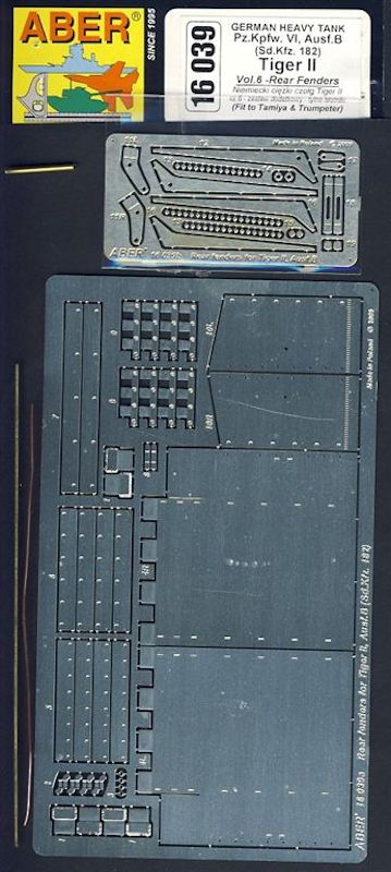 Dieser Ergänzungssatz ist sowohl für die frühen- als auch für die späteren Tiger II Modelle geeignet. Damit kann das Tiger II Modell von Trumpeter und Tamiya ergänzt bzw. überarbeitet werden. Im Lieferumfang befinden sich eine große Ätzteilplatine, Kupferdraht Ø 0,6mm, Messingdraht 0,8mm, 1,3mm Messingrohr und die Einbauanleitung. Anhand der Bauanleitung können die neuen hinteren Kettenabdeckungen mühelos zusammengebaut werden und so die vorhandenen Plastikteile ersetzen.