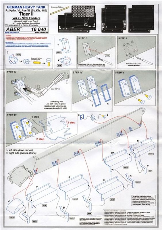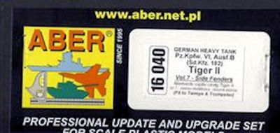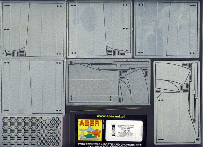 Dieser Ergänzungssatz ist sowohl für die frühen- als auch für die späteren Tiger II Modelle geeignet. Damit kann das Tiger II Modell von Trumpeter und Tamiya ergänzt bzw. überarbeitet werden. Im Lieferumfang befinden sich sechs große-, eine kleine Ätzteilplatine, Ø 0,8mm Messingdraht und die Einbauanleitung. Anhand dieser können die neuen seitlichen Kettenabdeckungen mühelos zusammengebaut werden und so die vorhandenen Plastikteile ersetzen. Das Anbringen der einzelnen Kettenabdeckungen kann mittels der etwas aufwendig zu erstellenden Sechskantbolzen geschehen oder man besorgt sich M1 Gewindeschrauben mit Sechskantkopf (gibt es z.B. bei RB Model).