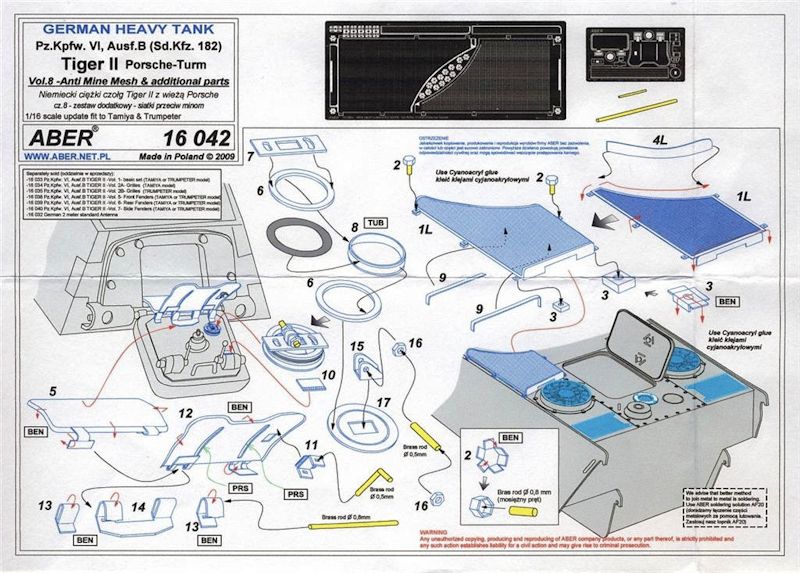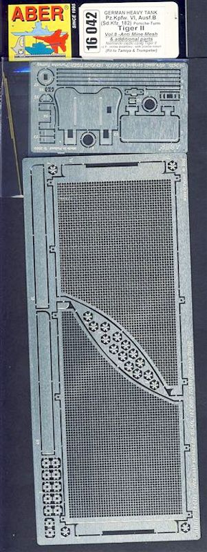 Dieser Ergänzungssatz ist für das Tiger II Modell mit Porscheturm von Trumpeter gemacht. Im Lieferumfang befinden sich eine große Ätzteilplatine, Ø 0,5mm- und 0,8mm Messingdraht sowie die Einbauanleitung. Anhand dieser können nun die neuen zusätzlichen Teile für die Heckluke des Porscheturms sowie die zusätzliche Gitterabdeckungen der Kühlerbelüftung (unter dem Turm) als Schutz vor Haftminen ergänzt werden.