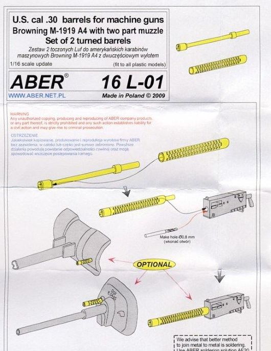 Für die amerikanischen cal. 30 Browning MG im Maßstab 1/16 bringt ABER in Messing gedrehte Gewehrläufe und Kühlmäntel heraus. Im Set enthalten sind ein Lauf und der Kühlmantel.