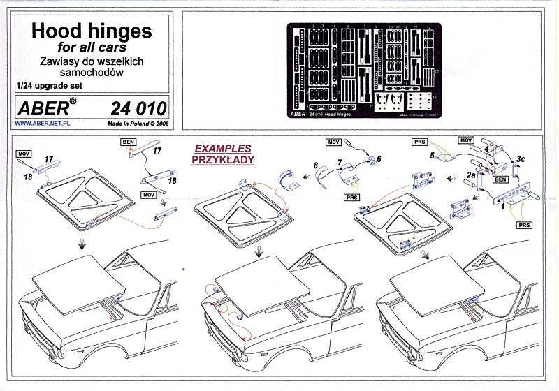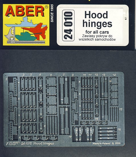 Damit wir auch unter die Motorhaben unserer "Lieben" schauen können, hat ABER einen Zurüstsatz mit Kleinteilen für die Haubenscharniere heraus gebracht. Der neue Ätzteilsatz beinhaltet mehrere verschiedene Halterungen für die diversen Öffnungsmechaniken der Motorhauben.