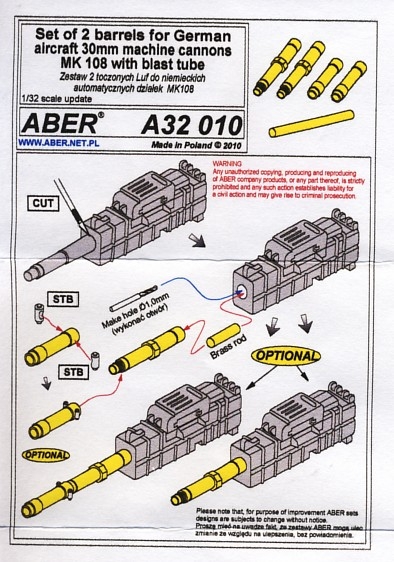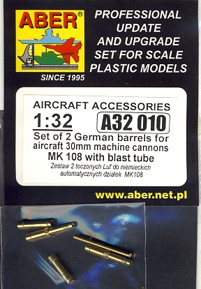 Als bestehende Artikel im Maßstab 1:35 gibt es von ABER zwei Kanonenläufe für die deutsche MK 108 Maschinenkanone. Das Set beinhaltet zwei in Messing gedrehte Läufe, zwei in Messing gedrehte Laufverlängerungen (blast tube), ein kleines Messingrohr und die Einbauanleitung.