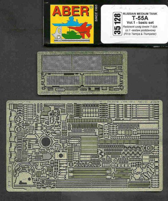 Nach dem Erscheinen des Kits des T-55 von Tamiya kommen nunmehr die passenden Ätzteile von Aber. Die Qualität der aus Neusilber geätzten Platinen ist, wie sollte es bei diesem Hersteller auch anders sein, sehr gut. Die 6(!)-seitige Bauanleitung zeigt übersichtlich, wie die fast 90(!) Kleinteile diese Sets zu verbauen sind. Neben den für russische Panzer schon fast obligatorischen Lüftergittern und Spannbändern für die Reservetanks am Heck, lassen sich Fülle von Kleinigkeiten verbessern, wie z.B. eine funktionsfähige Arretierung für das Schwallbrett. Wem das Innen und Außen der Turmluken, die Halterungen für die MG-Munition am Turm oder die Zusatztanks auf den Kettenabdeckungen zu "undetaliert" sind, der kann sich hier ordentlich "austoben". Halter und Stecker für die Treibstoffleitungen, Beschläge für die Kisten und Kleinteile für die Tiefwatanlage runden das Angebot ab.