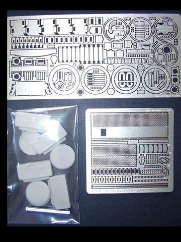 Weiter geht es mit dem Drahtgitter für die Abluft des Motors. Dann werden auf der oberen Wanne viele Halterungen für Werkzeug und Anbauten ergänzt darunter auch die Gitter für die Motor Belüftung die sehr schön geflochten wiedergegeben wurden. Auch können die Halterungen der Säge, das Abdeckblech über der Kanonenblende und der große Staukasten auf der Kettenabdeckung verfeinert werden. Mit diesem Basis Set ist dieser Russiche Panzer erstmal gut bedient. Es sind natürlich von ABER noch weiter Sets erschienen zwei weitere kann ich euch auch noch vorstellen.