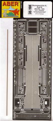 Als weiteres neues Zubehör für das Stug III von TAMIYA bringt ABER einen Ätzteilsatz für die seitlichen Kettenabdeckungen heraus. Ob der doch recht aufwendige Ergänzungssatz erforderlich ist, wird jeder für sich selbst entscheiden. Anhand der 2-seitigen Einbauanleitung werden die produktionsbedingten, etwas stärkeren Plastik Kettenabdeckungen, durch neue Abdeckungen in richtiger Materialstärke ersetzt.