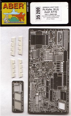 Für die aktuellen Pz.38(t) von TRISTAR kommen mehrere neue Ätzteilsätze von ABER heraus. Der erste Basissatz kann für mehrer Ausführungen (E/F/und G) verwendet werden. Er enthält 2 Ätzteilplatinen und in Resin gegossene Miniatur-Bolzen. Erstmalig hat man die Möglichkeit die Scharniere mit geätzten Bolzenköpfen, oder mit den beiliegenden, sehr filigran gegossenen, Bolzen zu versehen. Anhand der 4-seitigen Einbauanleitung werden folgende Bereiche überarbeitet oder ergänzt: Sämtliche Luken und Klappen erhalten bewegliche Scharniere, alle Werkzeughalter, die hintere Nebelwurfanlage und diverse Werkzeugkisten.