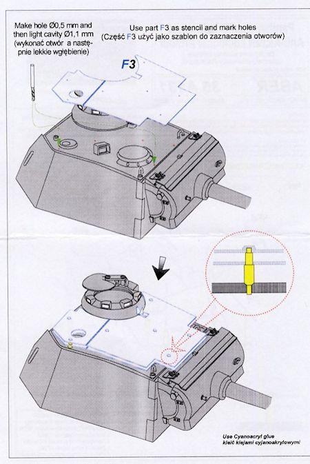 Anhand der zweiseitigen Bauanleitung wird gezeigt wie die Turmzusatzpanzerung korrekt mit den vorhandenen Messingabstandshaltern montiert wird.