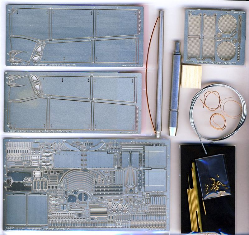 Der neue Super-Satze enthält 1 große- 2 mittelgroße- und eine kleine Ätzteilplatine, ein neues zweiteiliges in Aluminium gedrehtes Geschützrohr, ein in Messing gedrehten Tank MG 34 Lauf, 0,2mm-, 0,3mm- und 0,4mm-,1mm Drahtmaterial, 1,0mm Kabelmaterial, 0,5mm- und 2,0mm Messing-Rundmaterial, eine in Messing gedrehte Antenne, 22 in Messing gedrehte Distanzhalter, sechs in Messing gedrehte Miniatur Rohreinigungs-Stangen, einen Holz Unterlegklotz und die ausführliche Einbauanleitung.
