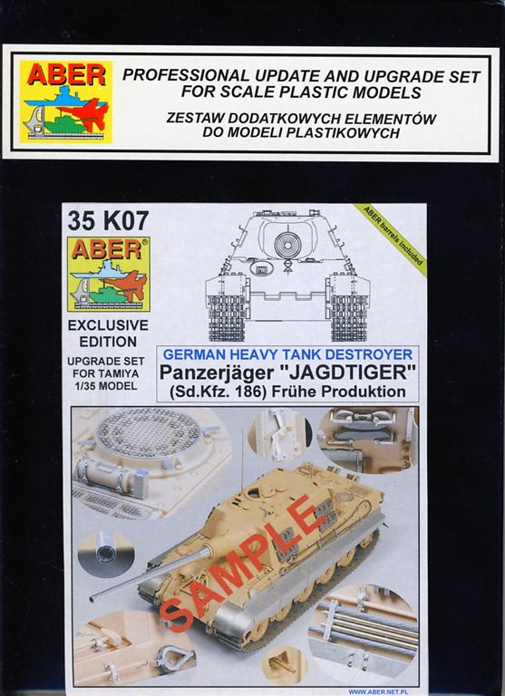 Als aktuelle siebte "EXCLUSIVE EDITION" gibt es von ABER einen neuen komplett Ätzteilsatz für den aktuellen Bausatz von TAMIYA: Sd.Kfz.186 Jagdtiger Early. Diese neue Produktlinie von ABER erspart den Käufer und "Sammler" von Ätzteilen, das "lästige" Zusammentragen aller Produkte für seinen Bausatz.
