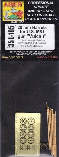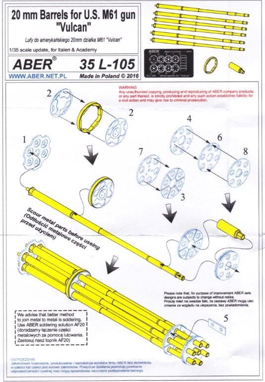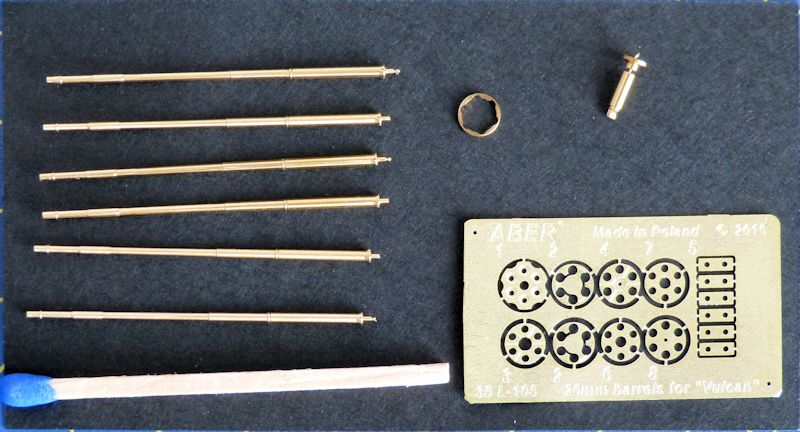 Für den M-163 mit Vulcan Kanone der Firmen Italeri (Nr.7066) und Academy (Nr.1360) bringt Aber das passende sechsläufige 20mm Geschütz in hervorragender Qualität heraus. In der Aber typischen Verpackung befinden sich die aus Messing gedrehten sechs Rohre. Auch zwei Kleinteile aus demselben Material sind der Packung beigegeben. Die Nachbildung der Rohre ist äußert filigran. Der vordere Mündungsbereich ist offen gestaltet. Die Rohre sind so gearbeitet, dass sie perfekt in die Bausatzteile von Italeri und Academy passen.