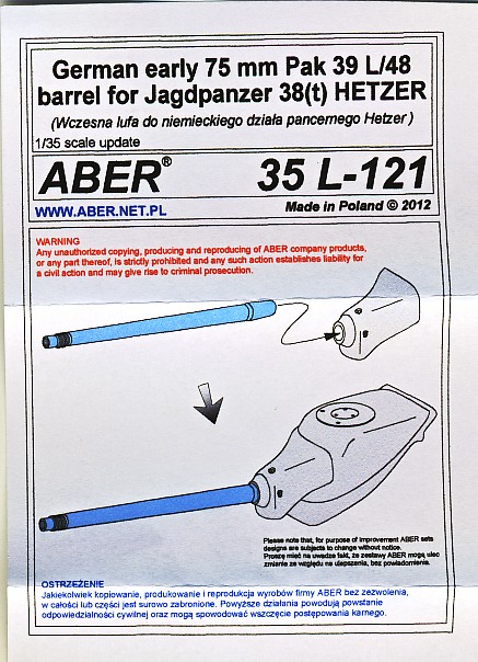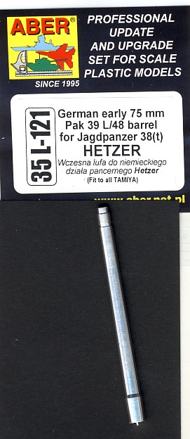 Für den deutschen Jagdpanzer 38(t) Hetzer bringt ABER ein in Aluminium gedrehtes Geschützrohr heraus. Im Lieferumfang befinden sich das gedrehte Rohr der neuen Generation mit den Rohrzügen im vorderen Mündungsbereich und der Einbauanleitung. Für den neuen Jagdpanzer Hetzer im Maßstab 1:35 von TAMIYA, ist dieses neue Geschützrohr von ABER bestens geeignet. Das Geschützrohr ist in der neuen Generation, mit vorderem Gewinde zum Aufdrehen des Mündungsdämpfers, gefertigt. Allerdings liegt dem Set kein Mündungsdämpfer bzw. die Mündungshülse bei. Da das im Hetzer eingebaute Geschützrohr keinen Feuerdämpfer wie der Tiger oder Panther hatte, sondern nur eine aufgeschraubte Hülse, waren vereinzelte Hetzer Jagdpanzer auch ohne die Mündungshülse im Gefecht.