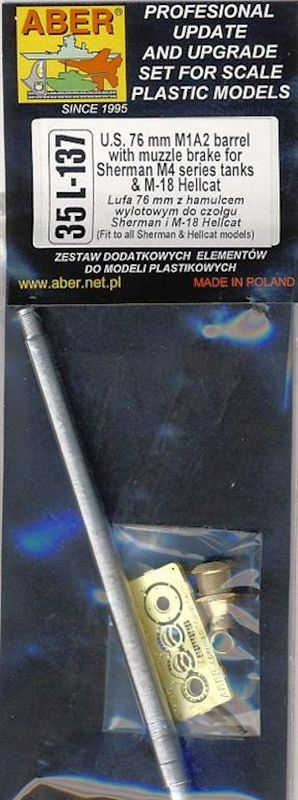 Für die amerikanischen Sherman M4 Panzerreihe, bringt ABER ein in Aluminium gedrehtes Geschützrohr heraus. Im Lieferumfang befinden sich ein gedrehtes Rohr der neuen Generation mit Rohrzügen im vorderen Mündungsbereich, eine in Messing gedrehte mehrteilige Mündungsbremse, ein kleiner Bogen Ätzteile und die Einbauanleitung. Das Geschützrohr ist in der neuen Generation, mit einem Gewinde zum Aufdrehen des Mündungsdämpfers, gefertigt. Es kann perfekt in die vorhandene Tamiya/Tasca Plastikgeschützrohrblende eingefügt werden.