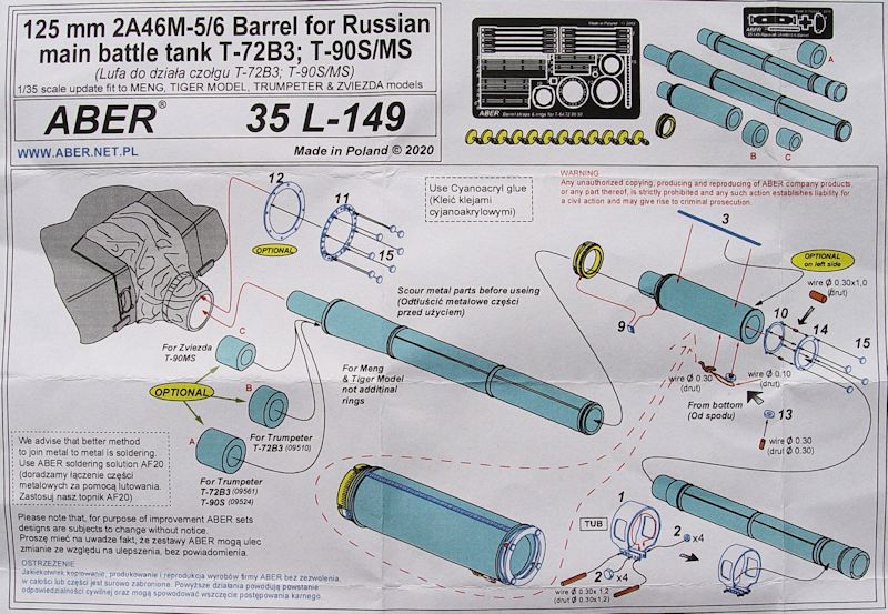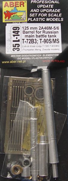 Die Firma Aber hat für den T-72B3 oder T90S/MS ein sehr gut gelungenes Alu-Rohr herausgebracht. Der Modellbauern hat jetzt die Wahl, entweder ein Plastikrohr aus seinem Bausatz nehmen oder dass von Aber. Dieser Rohrbausatz ist für Modelle der Firmen Meng, Trumpeter und Zvezda geeignet.