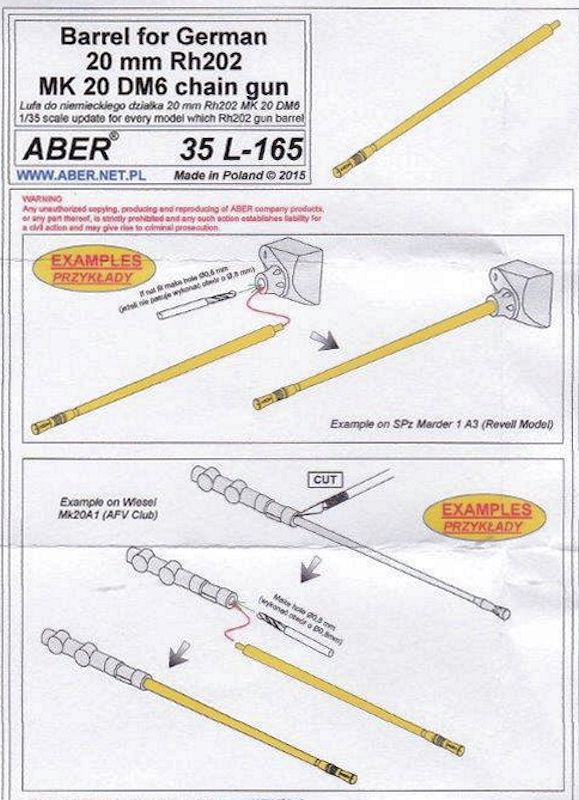 Für den Revell Bausatz des Schützenpanzers Marder 1 A3/ A5 der Bundeswehr und des Wiesel1 mit MK20 von AFV CLUB bringt Aber ein Messinggeschützrohr heraus.
