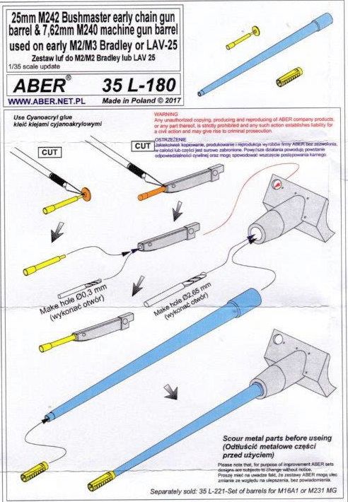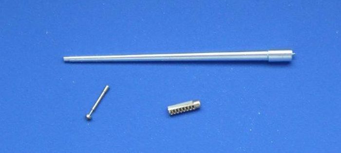 In der Aber typischen Verpackung befindet sich ein aus Alu gedrehtes Rohr. Im Mündungsbereich ist das Rohr wie üblich aufgebohrt. Die Mündungsbremse, hervorragend aus Messing gedreht, wird auf das Rohr gesteckt und mit Sekundenkleber fixiert. Der Mündungsfeuerdämpfer ist wie im Original auch hier durchbrochen. Sehr schöne Dreharbeit. Bei dem beiliegenden MG-Lauf ist der Mündungsbereich offen gestaltet. Die Anleitung erleichtert den doch recht einfachen Zusammenbau.