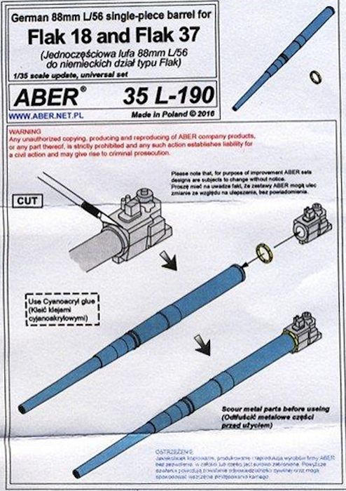 Für die legendäre deutsche 8,8cm Flak bringt ABER ein neues Geschützrohr heraus. Im Lieferumfang befinden sich ein in Aluminium gedrehtes Rohr mit den Rohrzügen im vorderen Mündungsbereich, ein gedrehte Messingteil und die Einbauanleitung.