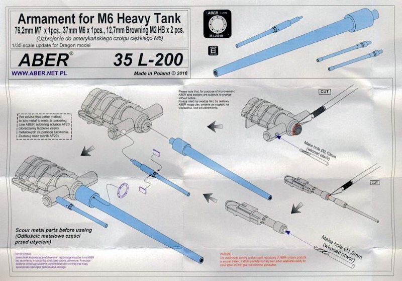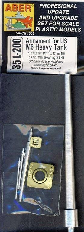 Für den schweren amerikanischen Panzer M6A1 bringt ABER ein neues Bewaffnungsset heraus. Es besteht aus zwei in Aluminium gedrehten Rohren mit Rohrzügen im vorderen Mündungsbereich, zwei Browning M2 MG-Läufen, zwei kleinen fotogeätzten Messingplatinen und der Einbauanleitung.