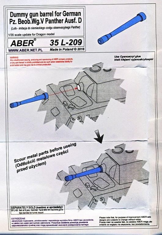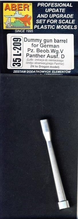 Für den deutschen Panzer Panther Ausf.D Pz. Beob. Wg. V bringt ABER eine in Aluminium gedrehte Geschützrohrattrappe heraus. Im Lieferumfang befinden sich das gedrehte Rohr und die Einbauanleitung.