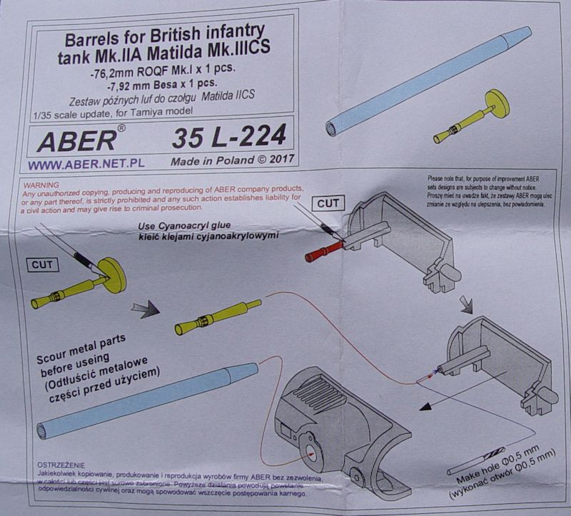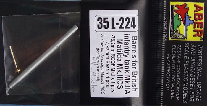 ABER, die Firma für gute Ätzteile und Alurohre hat für die Matilda von Tamiya ein passendes 76,2mm Geschützrohr und weiterhin einen sehr schönen Lauf des 7,92 Besa-MGs herausgebracht. Wie immer in sehr guter Qualität.