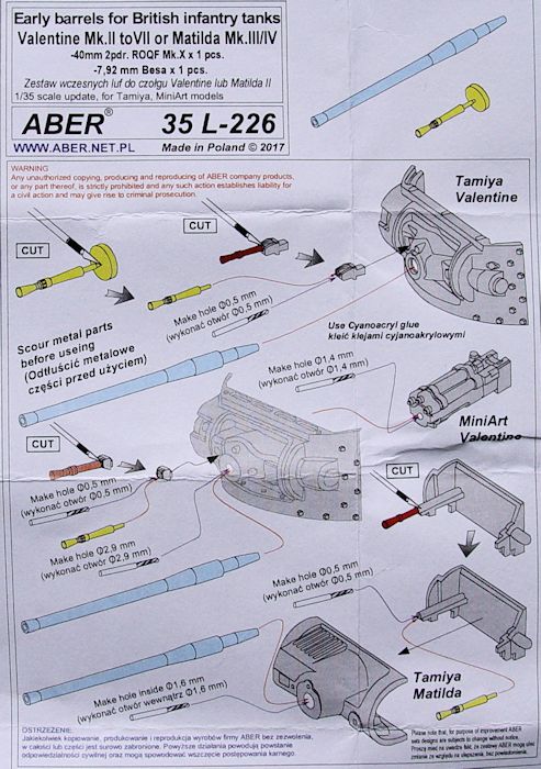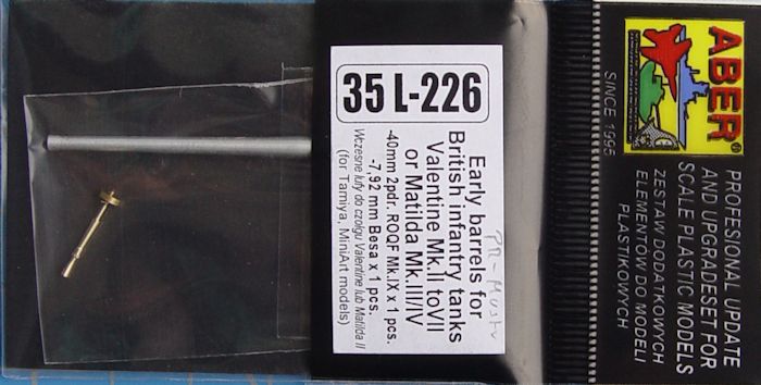 ABER, die Firma für gute Ätzteile und Alurohre hat für die Matilda von Tamiya ein passendes frühes Geschützrohr und weiterhin einen sehr schönen MG-Lauf herausgebracht. Wie immer in sehr guter Qualität.