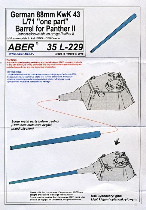 Für den Panther II bringt ABER ein weiteres Geschützrohr-Set heraus. Im Lieferumfang befinden sich das gedrehte Rohr der neuen Generation mit den Rohrzügen im vorderen Mündungsbereich und die farbige Einbauanleitung.