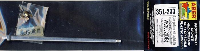 Für den deutschen Daimler Benz Prototyp Panzer VK3002 (DB) bringt ABER ein in Aluminium gedrehtes Geschützrohr heraus. Zum Lieferumfang gehören das gedrehte Rohr der neuen Generation mit den Rohrzügen im vorderen Mündungsbereich, eine in Messing gedrehte mehrteilige Mündungsbremse, ein kleiner Bogen Ätzteile und die neue farbige Einbauanleitung.