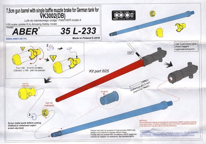 Für den aktuellen VK3002 (DB) Prototyp Panzer im Maßstab 1:35 von Amusing Hobby ist dieses neue Geschützrohr von ABER bestens geeignet. Das Geschützrohr ist in der neuen Generation, mit vorderem Gewinde zum Aufdrehen des Mündungsdämpfers, gefertigt. Das Geschützrohr ist so ausgeführt das es perfekt in die vorhandene Plastikgeschützrohrhalterung eingefügt werden kann.