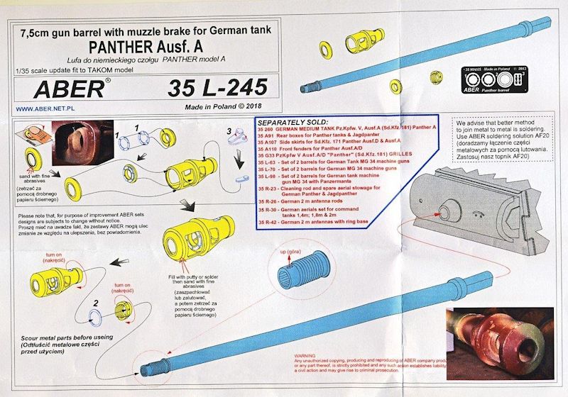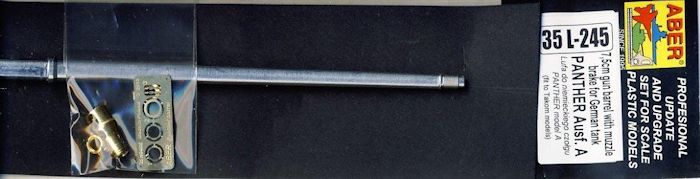 Für den legendären deutschen Panzer Panther Ausf. A bringt ABER ein weiteres Geschützrohr-Set heraus. Im Lieferumfang befinden sich das in Aluminium gedrehte Rohr der neuen Generation mit den Rohrzügen im vorderen Mündungsbereich, eine in Messing gedrehte mehrteilige Mündungsbremse, ein kleiner Bogen Ätzteile und die farbige Einbauanleitung.