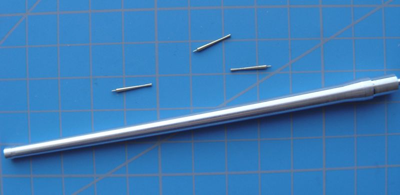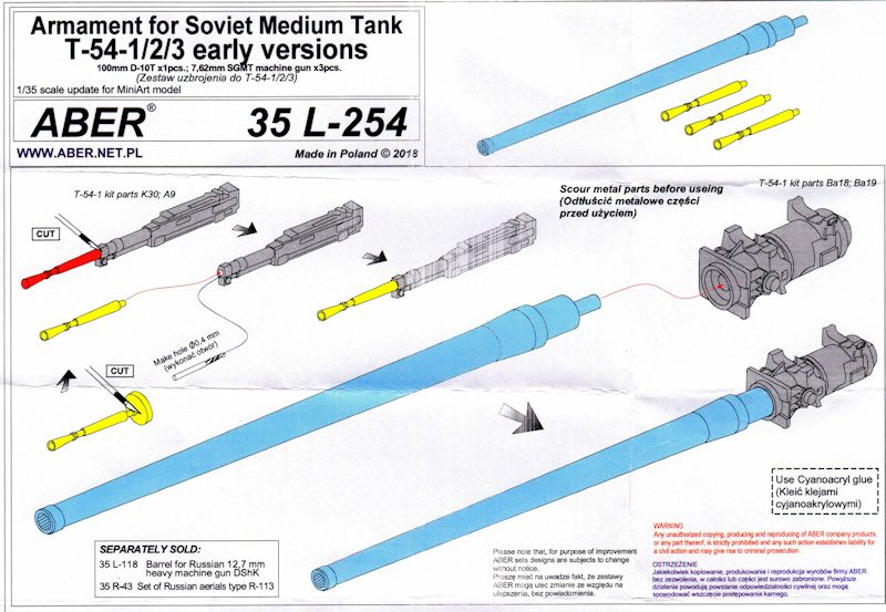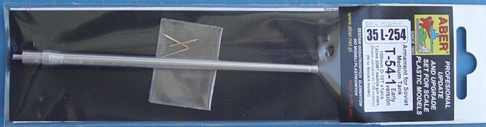 Die Firma Aber hat für die Modellreihe der T-54 Panzerfahrzeuge von Miniart ein "frühes Rohr" für den T-54-1 herausgebracht. Das Set beinhaltet neben der Kanone weiterhin drei aus Messing gedrehte MG-Läufe. Der Modellbauer hat jetzt die Wahl, entweder das Plastikrohr aus seinem Bausatz oder dass sehr gut gelungene Alu-Rohr von Aber zu nehmen. Der erfahrene Modellbauer greift natürlich zum Satz von Aber. Wie immer sehr gute Qualität.