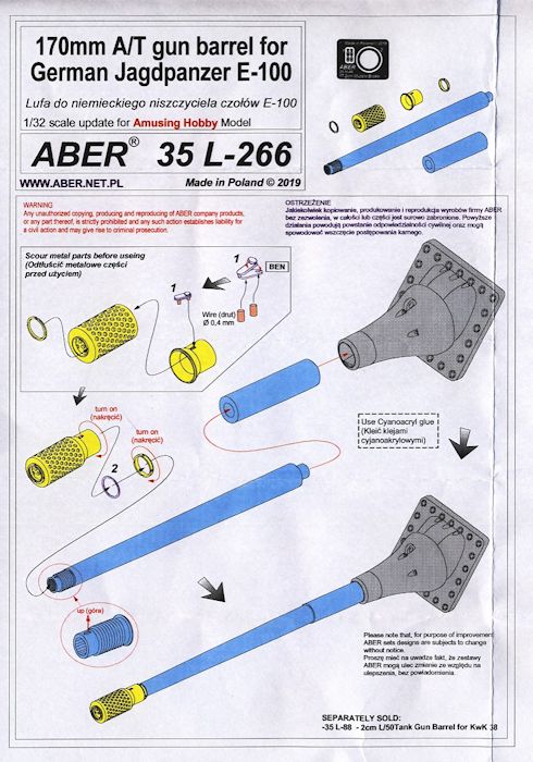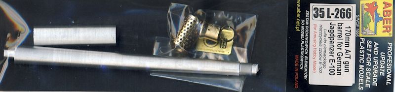 Für den deutschen schweren Versuchsjagdpanzer E-100 bringt ABER ein in Aluminium gedrehtes Geschützrohrset heraus. Im Lieferumfang befinden sich das zweiteilige, in Aluminium gedrehte Rohr der neuen Generation mit den Rohrzügen im vorderen Mündungsbereich, eine in Messing gedrehte mehrteilige Mündungsbremse, ein kleiner Bogen Ätzteile und die farbige Einbauanleitung.