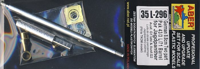 Für den deutschen schweren Jagdpanzer Jagdpanther Ausf. G1 und G2, bringt ABER ein gedrehtes zweiteiliges Geschützrohr mit separater Mündungsbremse heraus. Zum Set gehören das zweiteilige, in Aluminium gedrehte Rohr, mit den Rohrzügen im vorderen Mündungsbereich, ein in Messing gedrehter Übergangsring zur Rohrblende, eine in Messing gedrehte mehrteilige Mündungsbremse, zwei kleine Bögen Ätzteile und die farbige Einbauanleitung.