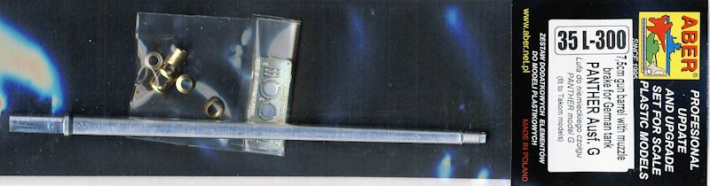 Für den legendären deutschen Panzer Panther Ausf. G bringt ABER ein gedrehtes Geschützrohr mit separater Mündungsbremse heraus. Dazu gehören ein mehrteiliges, in Aluminium gedrehtes Rohr mit den Rohrzügen im vorderen Mündungsbereich, eine in Messing gedrehte mehrteilige Mündungsbremse, ein kleiner Bogen Ätzteile und die farbige Einbauanleitung.