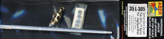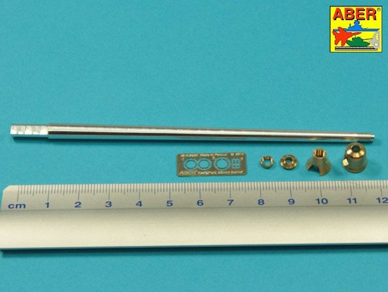 Für den deutschen schweren Jagdpanzer Jagdpanther Ausf. G1 frühe Produktion bringt ABER ein gedrehtes Geschützrohr mit separater Mündungsbremse heraus. Im Lieferumfang befinden sich das in Aluminium gedrehte Rohr mit den Rohrzügen im vorderen Mündungsbereich, eine in Messing gedrehte mehrteilige Mündungsbremse, ein kleiner Bogen Ätzteile und die farbige Einbauanleitung.