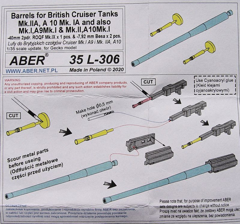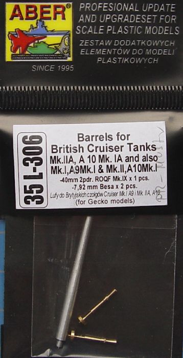ABER, die Firma für gute Ätzteile und Alurohre hat für diese Modellreihe ein passendes Rohr und auch noch passende Maschinengewehrläufe herausgebracht. Das Rohr besteht wie üblich aus Aluminium, der MG-Lauf aus Messing.