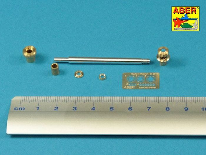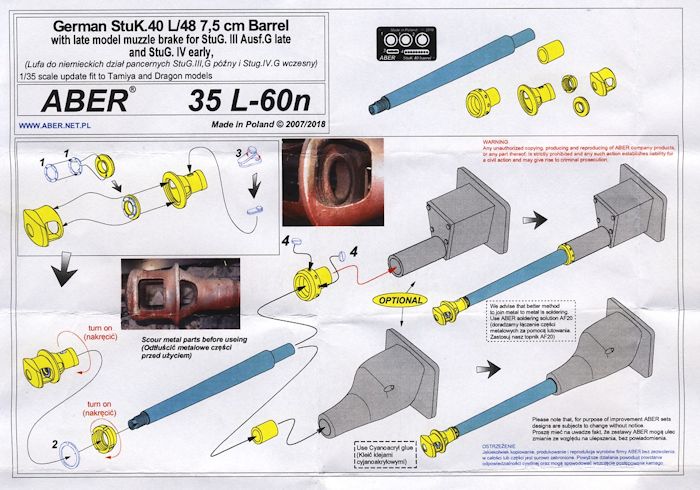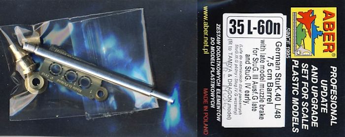 Für das deutsche Sturmgeschütz III Ausf.G bringt ABER ein weiteres Geschützrohr-Set heraus. Im Lieferumfang befinden sich das in Aluminium gedrehte Rohr der neuen Generation (n) mit den Rohrzügen im vorderen Mündungsbereich, eine in Messing gedrehte mehrteilige Mündungsbremse, ein kleiner Bogen Ätzteile und die farbige Einbauanleitung.