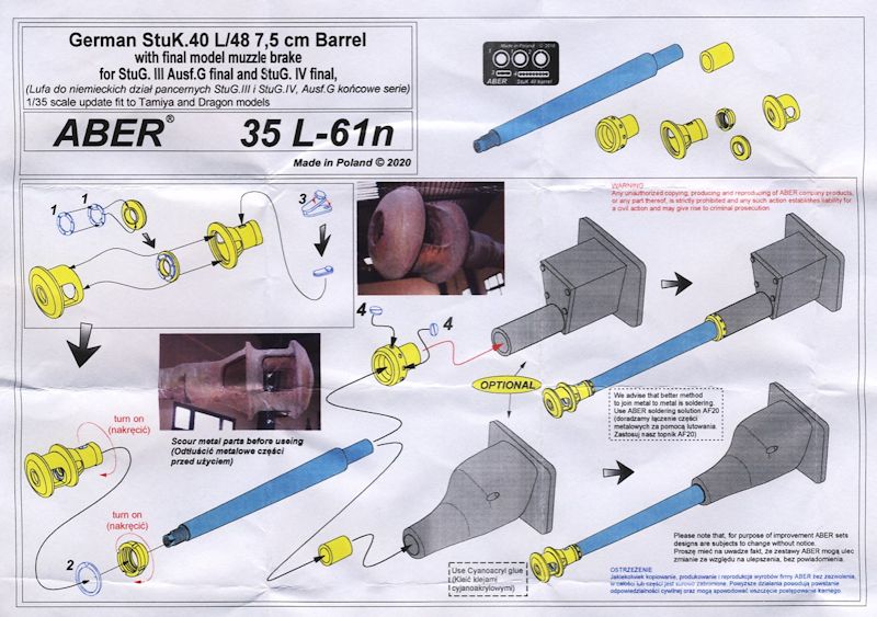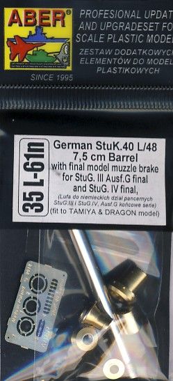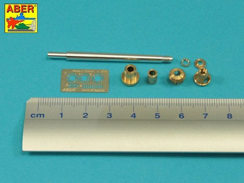 Für das deutsche Sturmgeschütz III, Ausf.G mit 75mm Kanone und Endmodell Mündungsbremse bringt ABER ein weiteres Upgrade Set heraus. Im Lieferumfang befinden sich das überarbeitete, in Aluminium gedrehte Rohr mit den Rohrzügen im vorderen Mündungsbereich und Außengewinde, ein in Messing gedrehter Übergangsring zur kastenförmigen Kanonenblende, eine in Messing gedrehte Übergangshülse für die Saukopfblende, eine in Messing gedrehte mehrteilige Mündungsbremse, ein kleiner Bogen Ätzteile und die farbige Einbauanleitung.